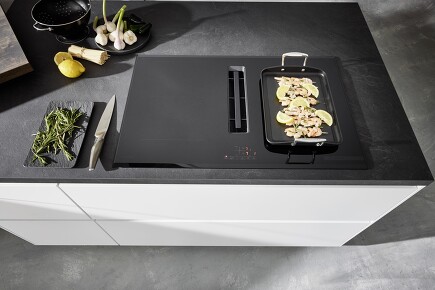 Die in leichter Schräge nach außen gerichteten Tischbeine fallen nicht nur ins Auge, sondern geben dem Kochtisch auch mehr Stabilität. Ideal ist der Einbau eines Induktionskochfelds, weil dieses selbst nicht heiß wird.